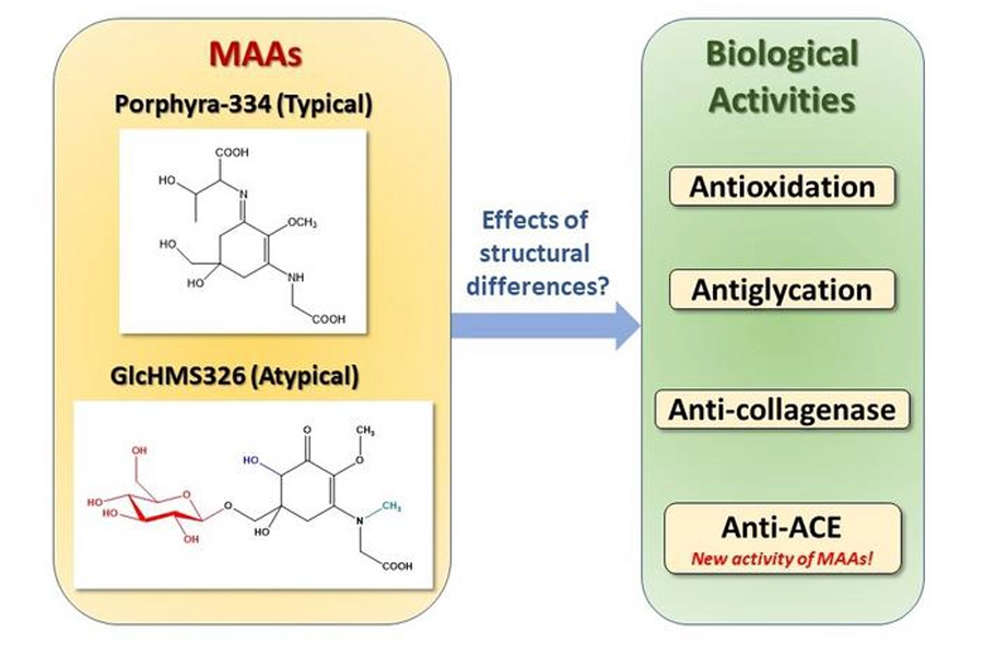 - Two MAAs — porphyra-334 and GlcHMS326 — showed antioxidant, anti-glycation, and collagenase-inhibiting activity, indicating possible anti-aging and skin-protective effects.