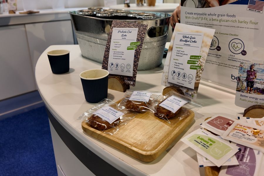 At Beneo’s booth, visitors can sample prebiotic oat lattes, whole-grain breakfast cookies, and high-protein, gluten-free tortilla chips.