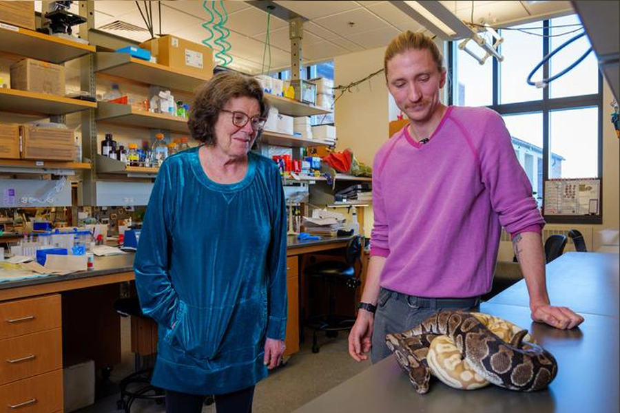 Leinwand and graduate student Skip Maas observe Maas’ two pet pythons, Gaius and Agrippina.“This is a perfect example of nature-inspired biology. You look at extraordinary animals that can do things that you and I and other mammals can’t do, and you try to harness that for therapeutic interventions.”